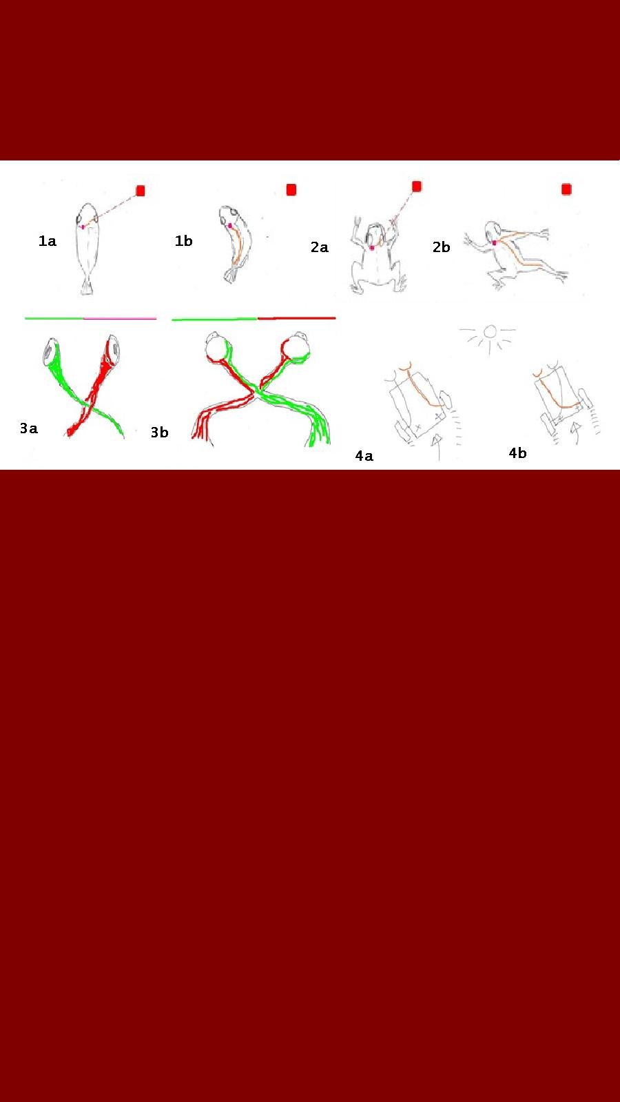 Fig. 1+2: Flugtrespons i dyr med lemmer eller finner. For at flygte fra en potentiel fare (som registres i modsatte hjernehalvdel (1a+2a)), skal det motoriske signal krydse tilbage over midten, for at aktivere finner eller lemmer på samme side som sanseorganet, for at skubbe dyret bort fra faren (1b+2b). Dette gælder både for fritsvømmende fisk (fig. 1) og landlevende hvirveldyr, som f.eks. padder (fig. 2).